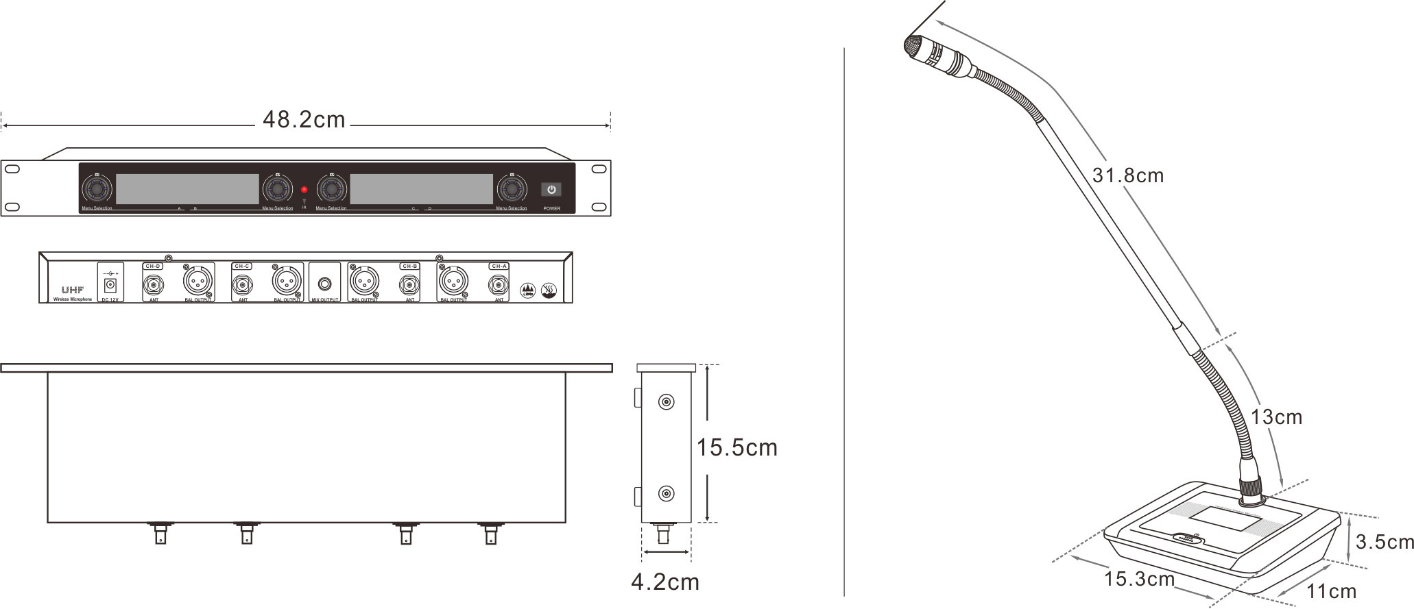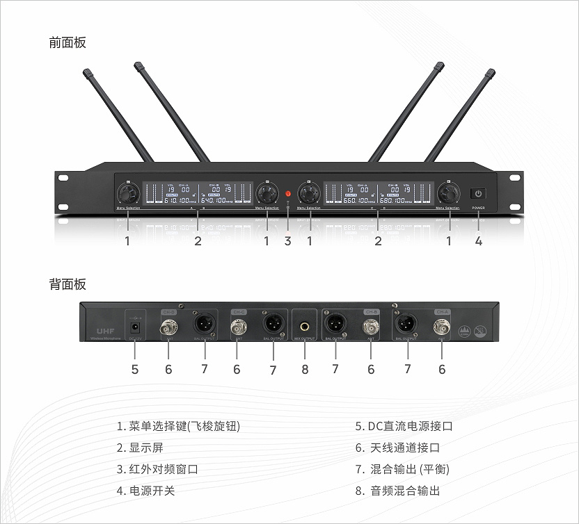 • A/B/C/D通道独立输出采用国际标准的XRL卡侬接口,混合输出采用TRS(6.3mm)二芯接口接收机参数: